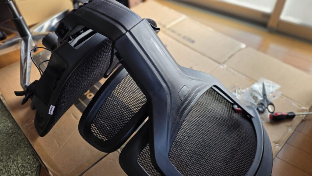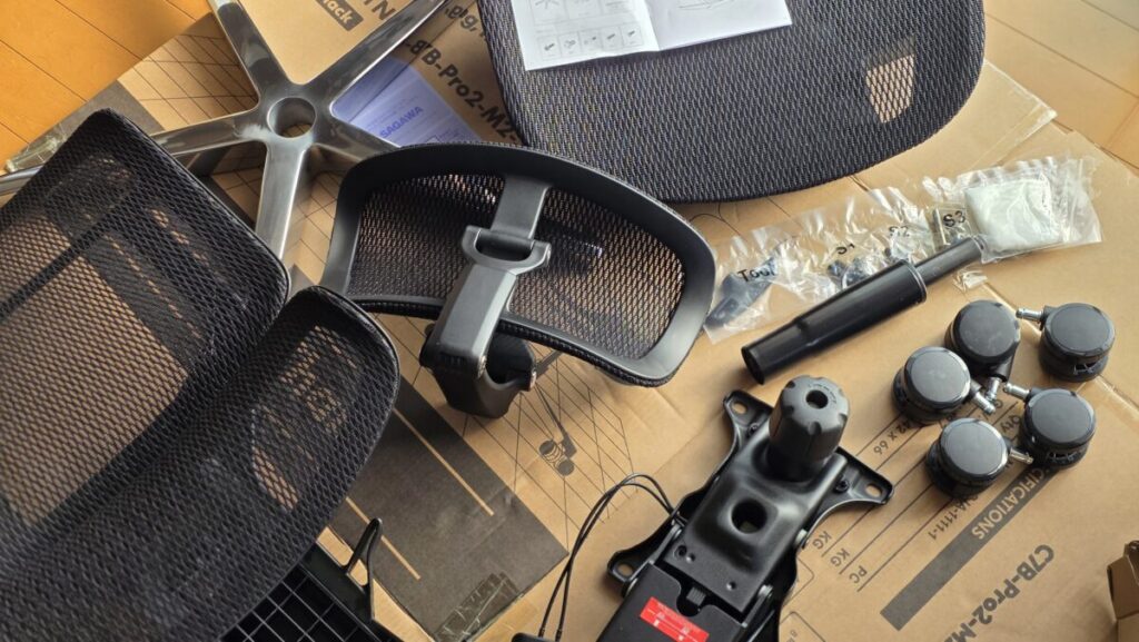 組み立ては一般的なオフィスチェアと同じ工程で、特に難しい部分はありません。