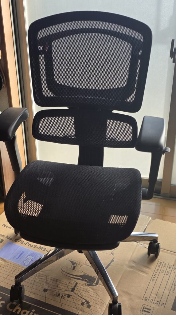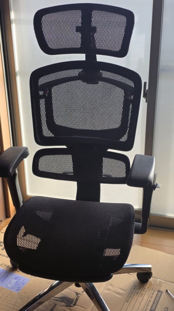 実際にしばらく使ってみて感じたのは、「価格に対して機能性がかなり強い、実用特化型のチェア」という印象でした。この記事では、組み立て・見た目・座り心地・機能性など、実際に使って感じたポイントを中心にレビューしていきます。