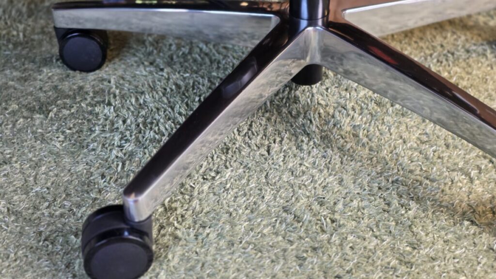 そんな中で良いアクセントになっているのが、シルバーのチェアベース。ここがブラック一色だと少しチープに見えがちですが、シルバーが入ることで全体の印象が引き締まり、安っぽさをうまく抑えています。