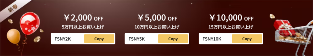 新春セール期間中は、購入金額ごとに使用可能なお得なクーポンが配布中。もちろんセールとの併用可能!