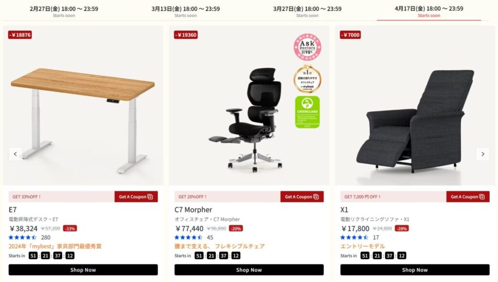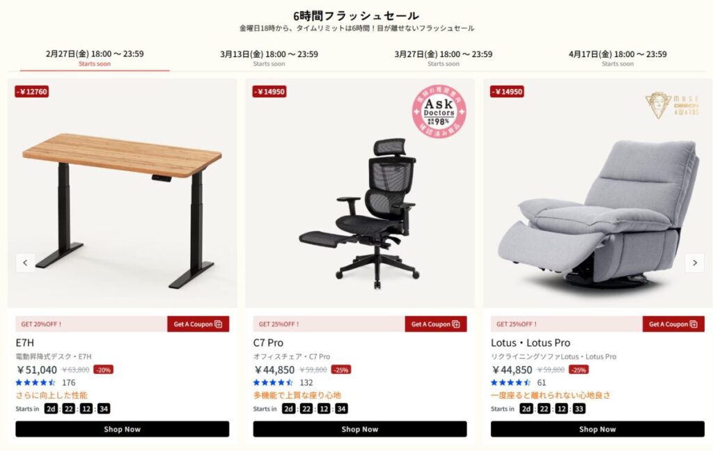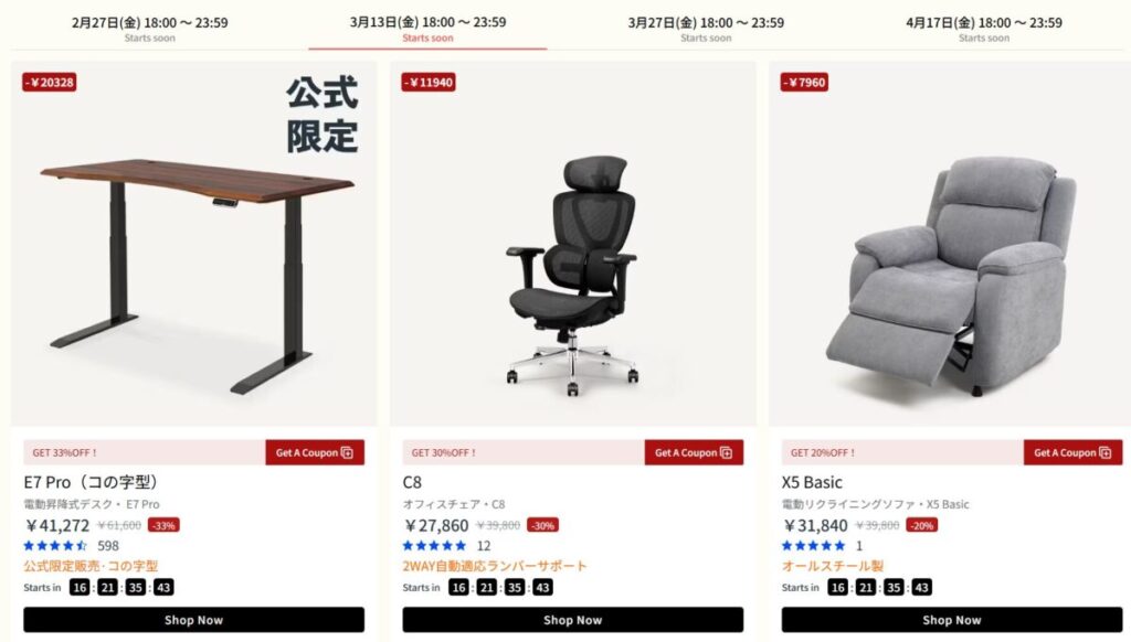 FlexiSpot公式サイトで行われるセールの時期は例年、以下の通りです。