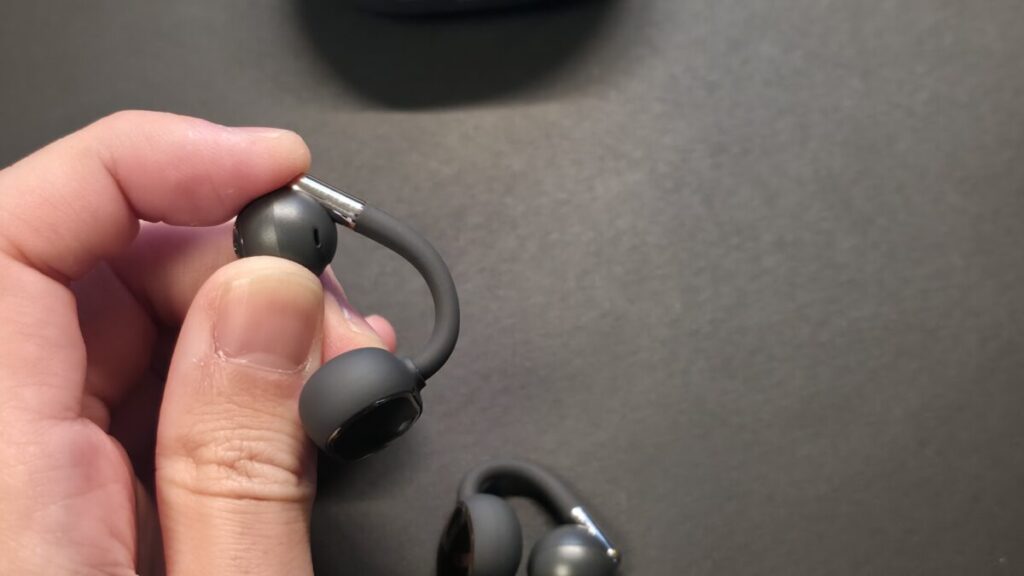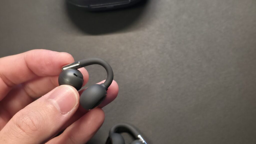 Clip1は非常に軽く、素材も柔らかいため、耳への負担がかなり少ないです。カナル型イヤホンのように耳の中に入れない構造なので、長時間装着していても圧迫感がありません。