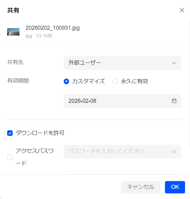 とはいえ完全公開ではセキュリティが心配な昨今。任意で「有効期間」や「パスワード」の設定が出来るので、この点も安心です!